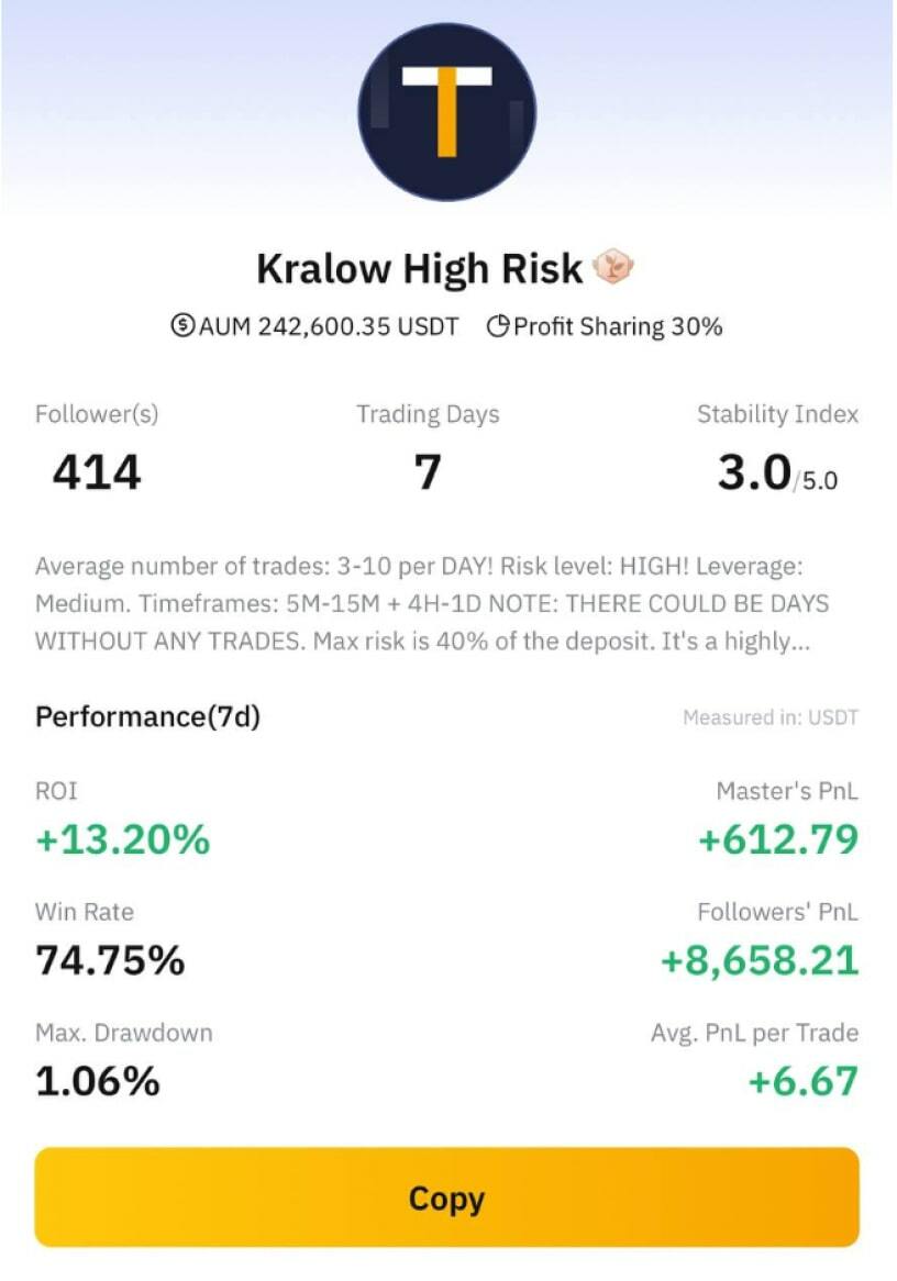 Thomas Kralow or his company is not an investment, financial, tax, or legal advisor or a broker-dealer and does not purport to provide personalized investment, financial, tax, or legal advice in any form. The Company does not recommend the purchase of particular securities, nor does the Company promise or guarantee any particular investment results. You understand and acknowledge that there is a very high degree of risk involved in trading securities and, in particular, in trading futures, options, spot and crypto in general. You acknowledge and agree that you, and not the Company or Thomas Kralow personally, are solely responsible for your own investment research and decisions. Do not trade with money that you cannot afford to lose. You understand that Thomas Kralow and all associated companies encourage you to investigate and fully understand any and all risks before investing or trading. The Company and Thomas Kralow assume no responsibility or liability for your trading and investment results, and you agree to hold the Company and Thomas Kralow harmless for any such results or losses. You acknowledge and agree that by copying the trades of Thomas Kralow on Bybit, including following the signals provided by his team of traders, you are doing so at your own risk, and neither Thomas Kralow, nor his company, nor Bybit, is or will be responsible for your actions, your trading or investing performance, or monetary results.