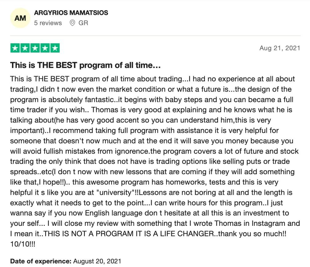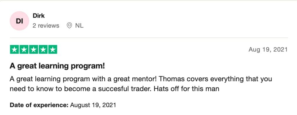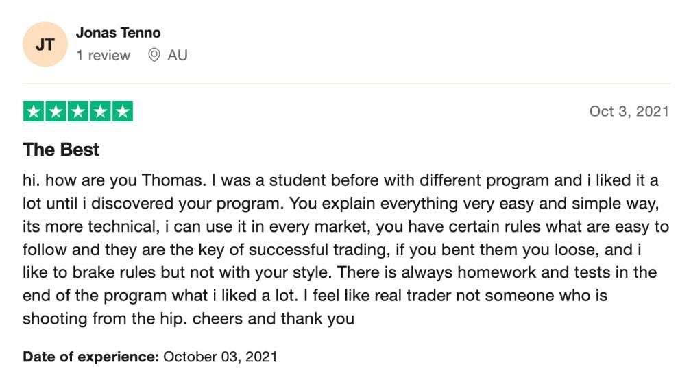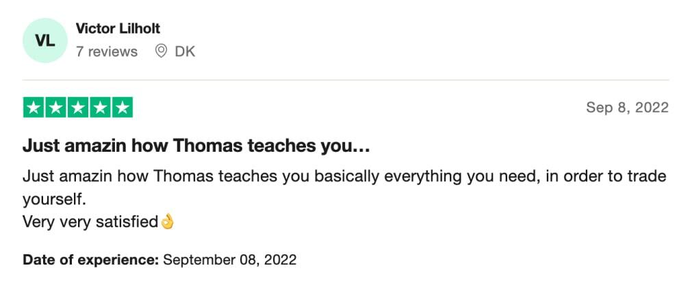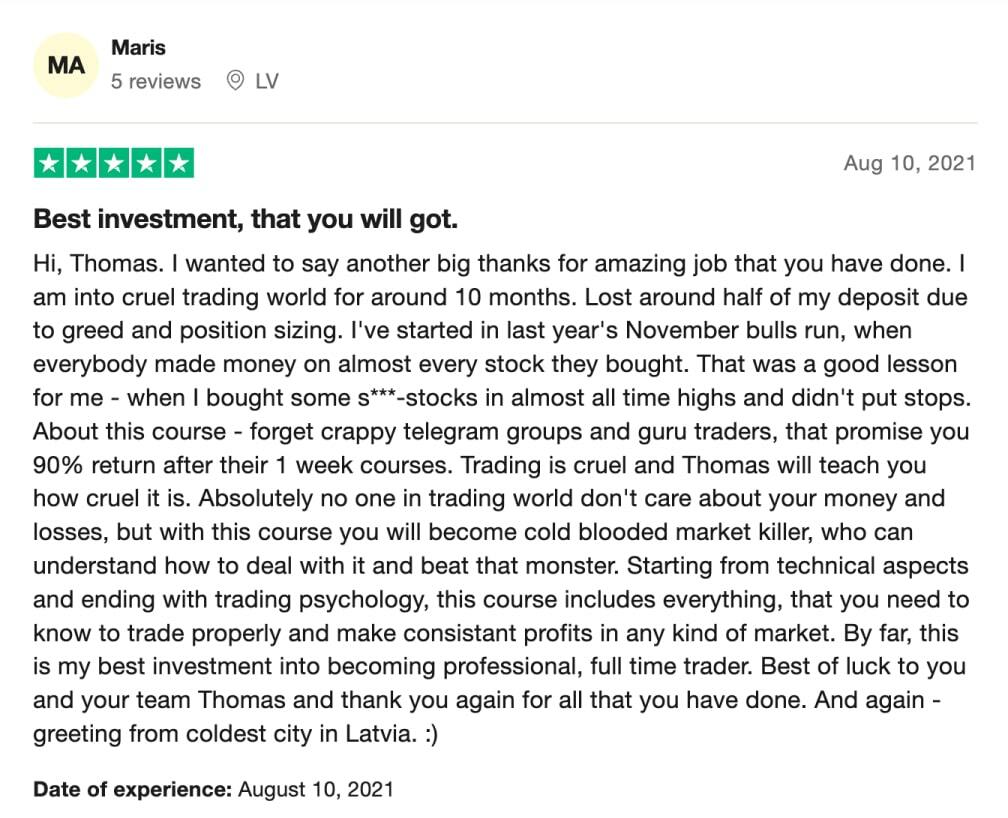 I've already taken trading courses, but I quickly became disappointed in them, there was no practical value. At Thomas's education, I finally don't feel lost. I learned to think and make decisions like a profitable trader. I have guidance and mentorship. I learned money and risk management, great technical analysis. The program takes you into baby steps so you get your result.