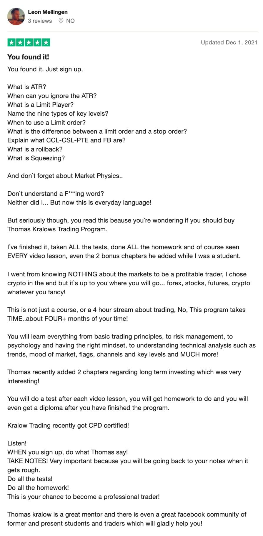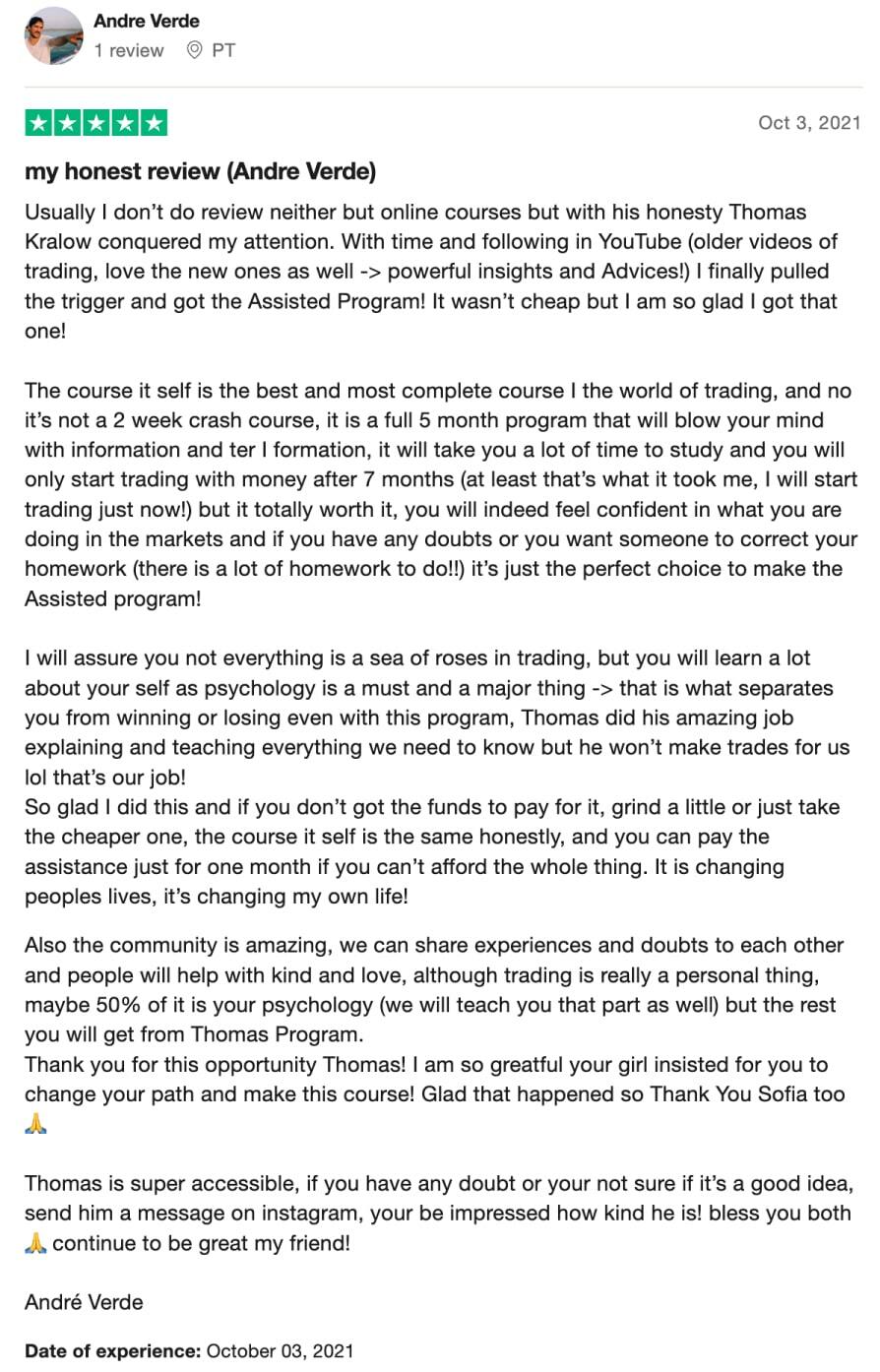 I used to spend months searching for information about trading. Every topic that a trader should know is covered in Thomas's program: from trading strategies to risk management, psychology! Thomas checked each of my notes to make sure I was taking full advantage of the program.